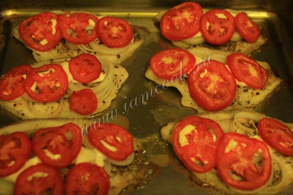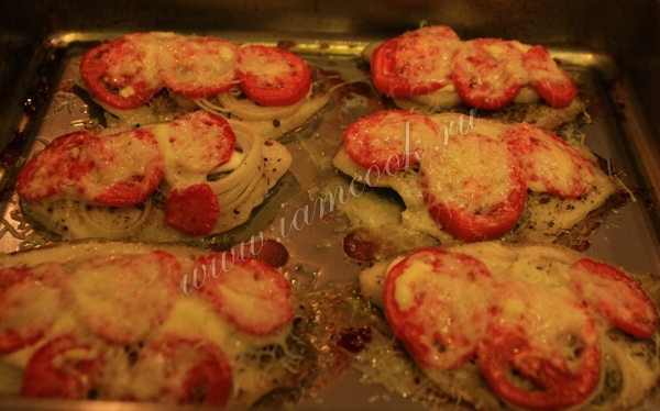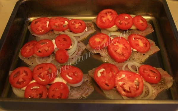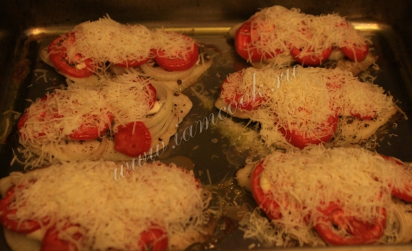 Далее разогреем до 180 градусов духовой шкаф. Выложим поверх лука заранее подготовленные помидоры и уберем в духовку на 40 минут.
