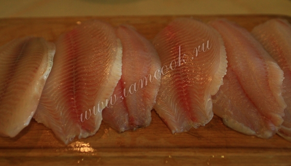 Вымоем кусочки филе телапии под струей прохладной волны и выложим на доску.