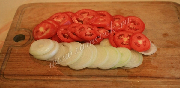 Порежем кольцами лук и кружочками помидоры. На мелкой терке натрем сыр Пармезан.