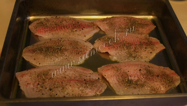 На противень выльем немного оливкового масла, так чтобы оно покрыло всю его поверхность. Выложим на него подготовленные нами на предыдущем шаге куски филе Тилапии.
