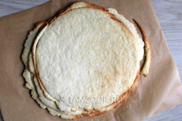 После снятия - скатывания готового коржа - бумагу можно снова использовать для формирования следующих коржей. Если позволяет духовка, то пеките сразу по два коржа.
