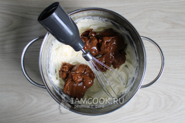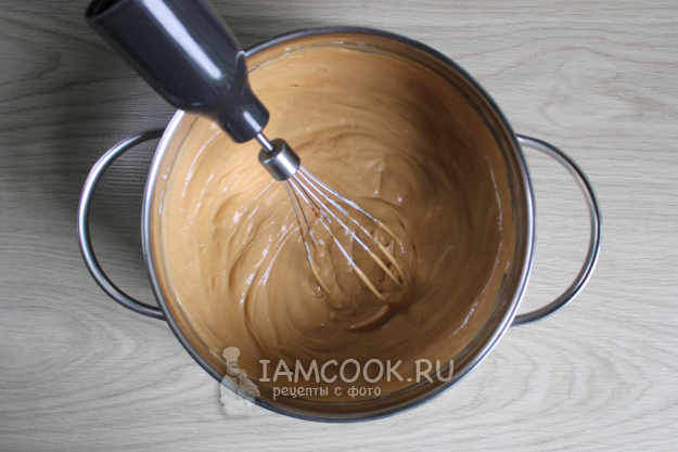 Добавьте во взбитое масло варёную сгущенку, ром или коньяк (если нет противопоказаний и предубеждений) и перемешайте до однородного состояния.