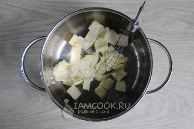 За это время приготовьте крем. Сначала взбейте до пышности размягченное сливочное масло, в течение 3-4 минут.
