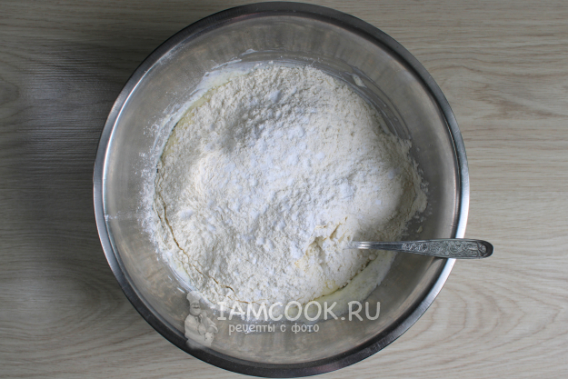 Добавьте муку и разрыхлитель.
