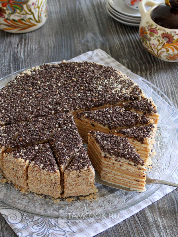 Собранному торту дайте полчаса постоять при комнатной температуре, чтобы он лучше пропитался. Затем держите до подачи в холодильнике, а подавайте через 3-4 часа, когда и коржи пропитаются благодаря сметане в креме и все слои схватятся благодаря сливочному маслу.