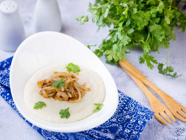 Затем добавить манную крупу, щепотку соли и сахар по вкусу. Я добавила 2 столовых ложки.