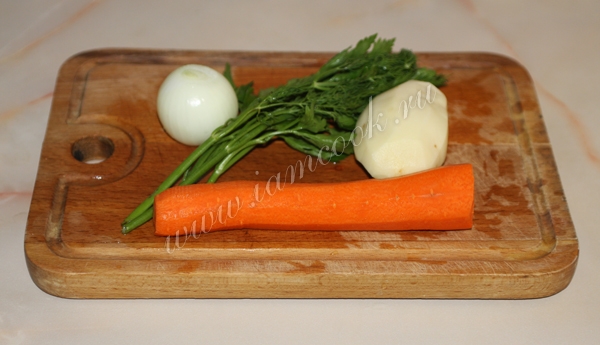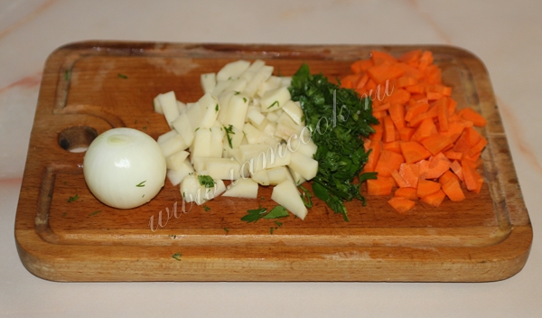 Картофель и морковь и зелень нарежем, как на фотографии. С луком ничего не надо делать, для куриного супа отлично подходит целиковая луковица.