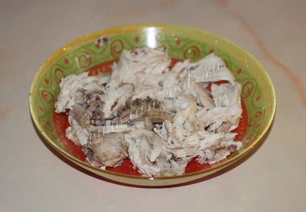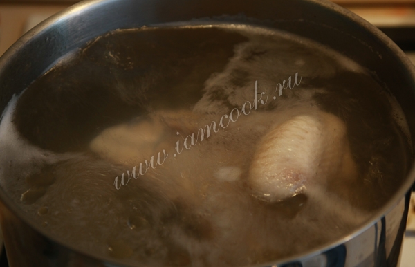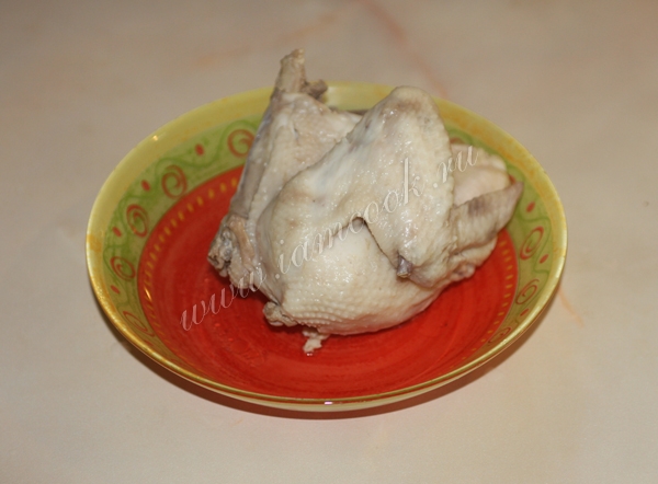 После того, как бульон готов, достанем из него курицу и дадим ей немного остыть.