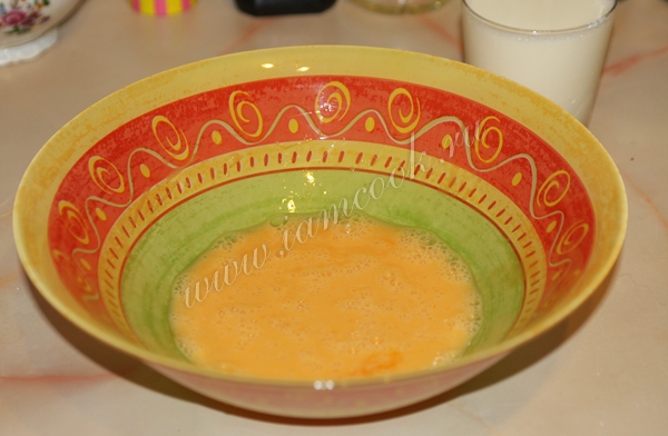 В глубокое блюдо разбить 3 куриных яйца и взбить.