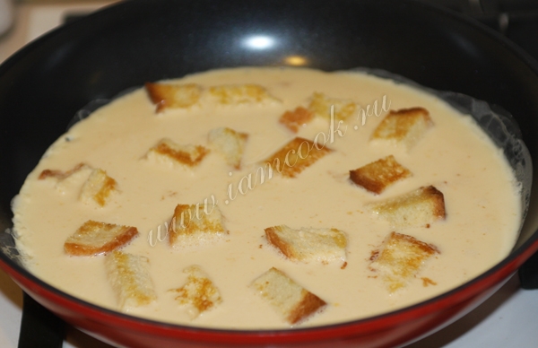 Когда гренки готовы, заливаем из молочно-яичной смесью, солим и перчим, а также добавляем зелень.
