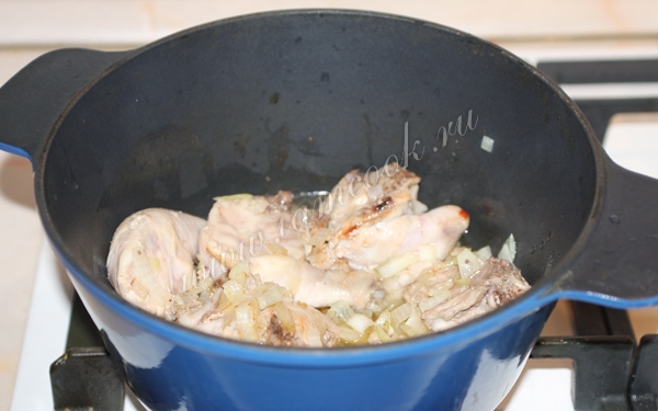 Цыпленка разрезать на крупные куски, мелко нарезать репчатый лук. В казане разогреть растительное масло и обжарить курицу с луком в течении 10-ти минут помешивая.