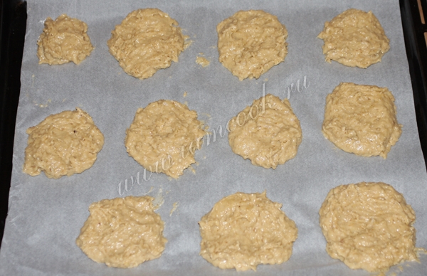 На противень расстелить бумагу для запекания. Столовой ложкой выложить наши будущие овсяные печенья. Духовой шкаф разогреть до 200 градусов и выпекать около 10-15 минут. Готовность печения можно определить проткнув его зубочисткой. Если тесто не прилипает, значит все готово.