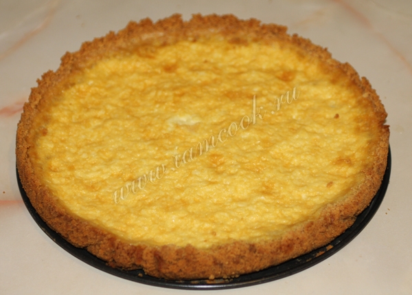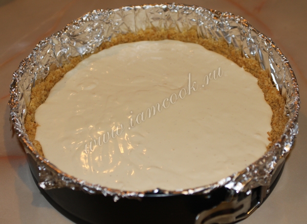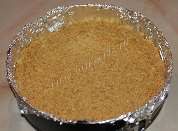 Форму для выпечки выложить фольгой, печенье с маслом выложить в форму, утрамбовать и сделать бортики. Минут на 30 убрать в холодильник.