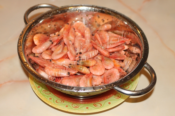 Замороженные креветки выложить в дуршлаг и как следует промыть прохладной водой. Оставить их в нем на 10 минут, чтобы стекла вода.