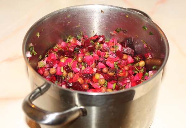 PS: срок годности у такого винегрета не такой уж и большой, постарайтесь съесть его за 2-3 дня. Для увеличения срока хранения добавляйте соленые огурцы непосредственно перед подачей.