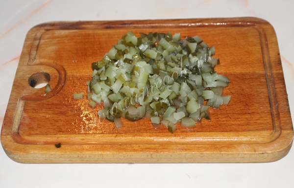 Мелко нарезать соленые огурцы.