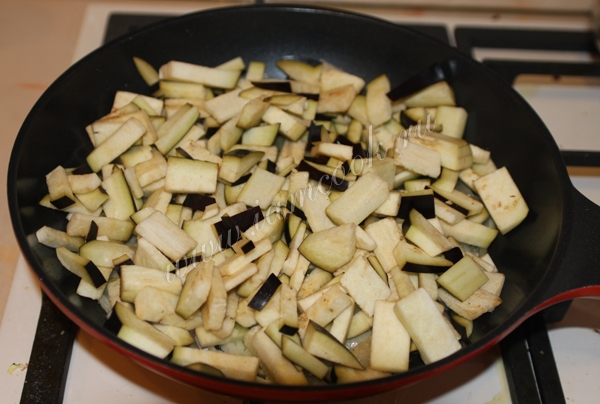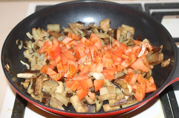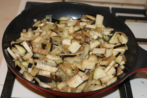 Перемешать и обжаривать баклажаны с луком около 15 минут.