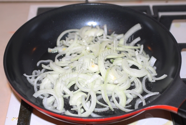 Репчатый лук нарезать полукольцами. В сковороде разогреть растительное масло и обжарить его до прозрачности.