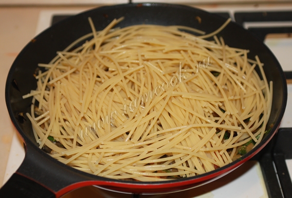 Макароны отварить до полу-готовности, промыть в дуршлаге и добавить на сковороду к овощам. Перемешать, влить стакан воды, накрыть крышкой и тушить 10 минут до готовности макарон.