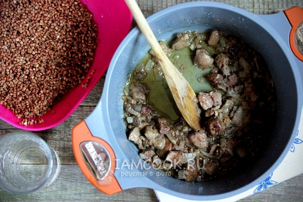 Переложите печень к луку и обжарьте её, часто помешивая, до посветления. Тем временем гречневую крупу промойте, воду слейте.