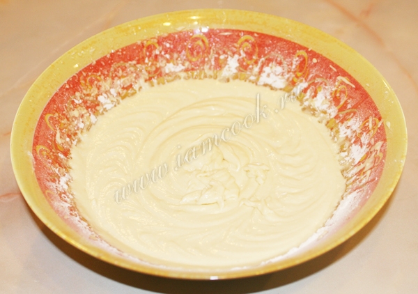 Ввести муку, перемешать при помощи миксера или блендера. В шарлотке на кефире тесто, в отличии от классического варианта, получается достаточно густое.
