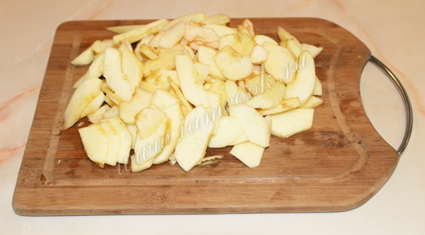 Теперь займемся начинкой. Яблоки вымыть, очистить от кожуры при помощи обычного овощного ножа. Изъять сердцевину и нарезать тонкими пластинками.