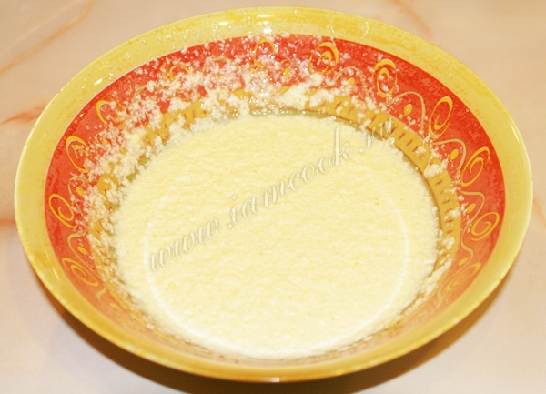 Добавить яйцо, кефир и соду, хорошенько перемешать.