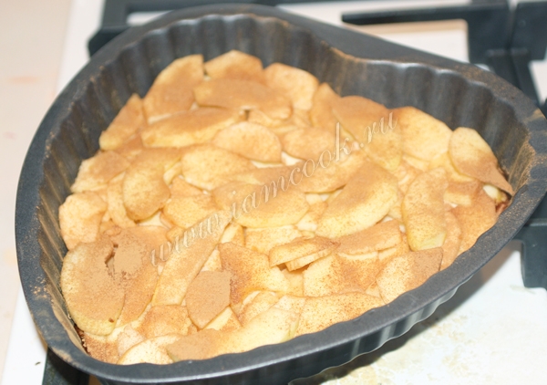 Вылить в форму половину теста, затем выложить аккуратно яблоки. Посыпать яблоки равномерным слоем корицы.