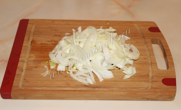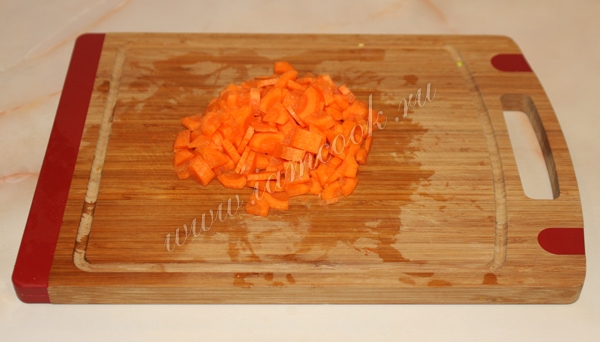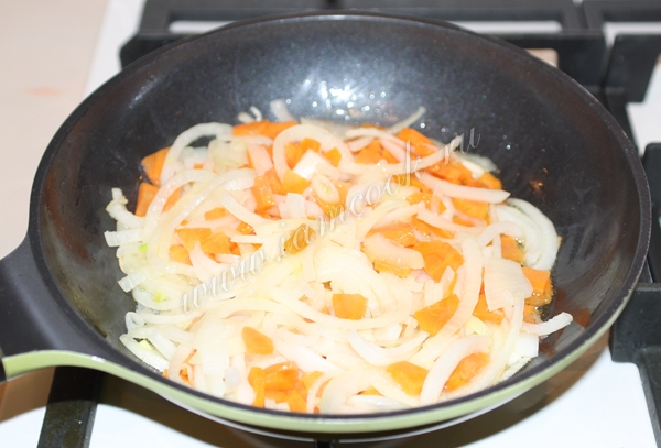 Морковь обжарить с репчатым луком на сковороде. Разогреть сковороду, влить растительное масло. Выложить сначала лук, обжарить помешивая около 2-3 минут. Добавить морковь, продолжить обжаривать 5-7 минут.