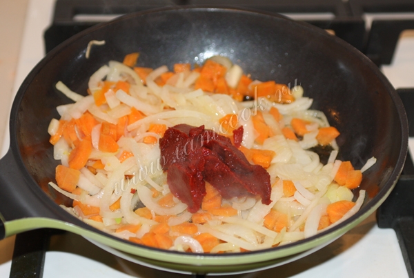В обжарку добавить 2 столовые ложки томатной пасты, перемешать и продолжить обжаривать еще 3-4 минуты.