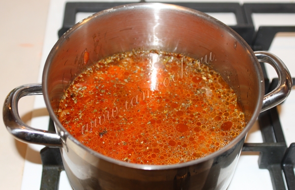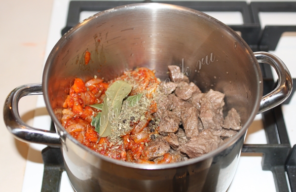 Обжаренное мясо и томатную овощную обжарку сложить в кастрюлю. Добавить черный перец горошком, лавровый лист, добавить травы по вкусу, например: сушеный базилик, укроп, петрушку.