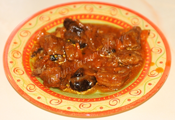 Влить 500-600 мл горячей воды из чайника, поставить мясо с овощами на огонь. Наполовину прикрыть кастрюлю крышкой, довести до кипения и тушить говядину около 50 минут на среднем огне. Затем добавить чернослив, приправить солью, томить еще 10 минут.