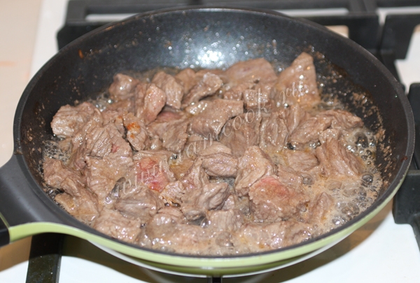 Отдельно обжарить мясо на сковороде с 2-3 столовыми ложками растительного масла. Обжаривайте 10-15 минут. Сначала на сильном, затем на среднем огне.