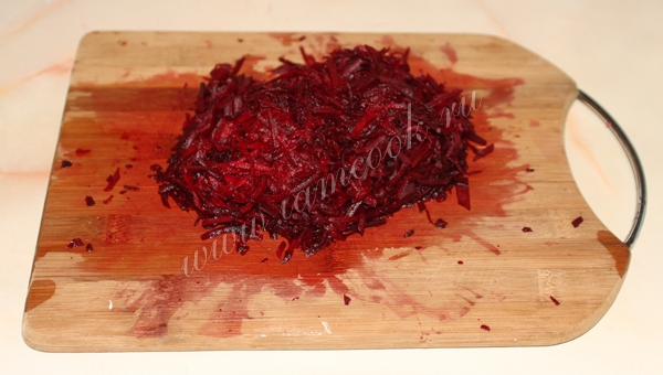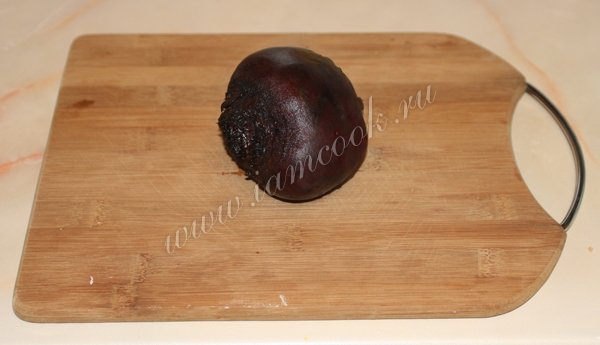 Одну или две свеклы в зависимости от размера вымыть и отварить в кастрюле 30-40 минут, либо запечь.