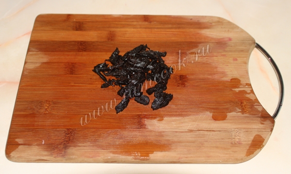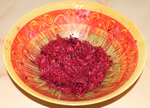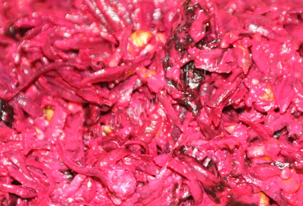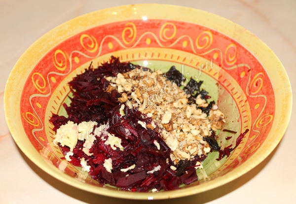 В салатницу выложить свеклу, орехи и чернослив. Выдавить 2 зубчика чеснока и слегка подсолить.