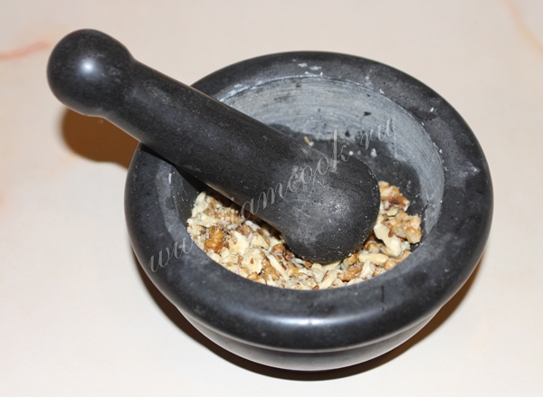 Грецкие орехи измельчить в ступке или при помощи блендера.