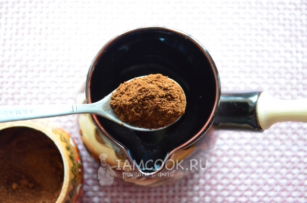 В сухую турку насыпьте 2-3 чайных ложки молотого кофе. Лучше использовать кофе среднего или мелкого помола, чтобы лучше заварился. Кофе мелкого помола можно заваривать прямо в чашке, залив кипятком.