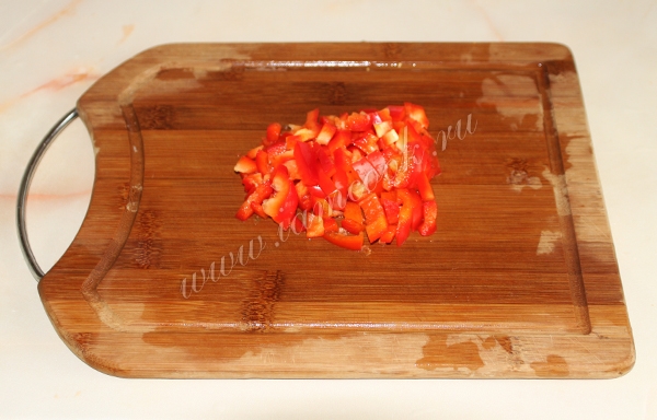 Сладкий перец очистить от семян и нарезать половину соломкой.