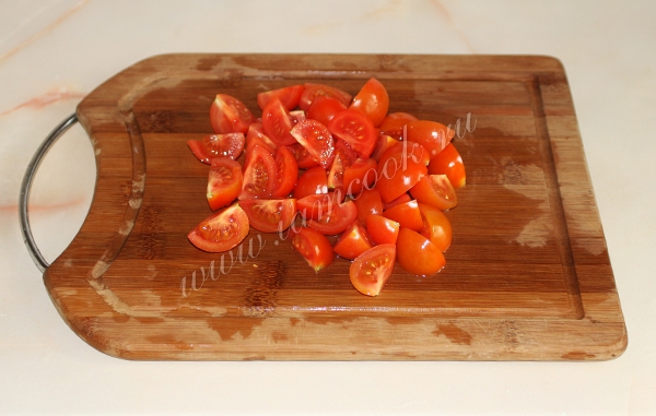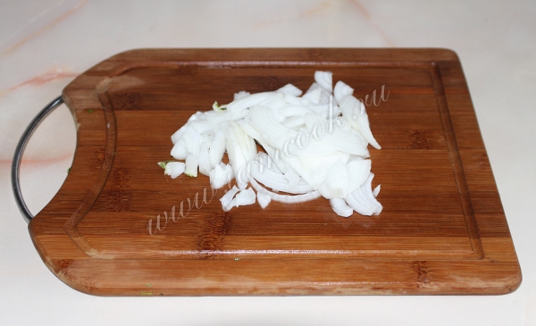Половинку репчатого лука нарезать четверть кольцами. Лучше всего взять для этого салата именно белый лук, так как он более сладкий, чем обычный репчатый. Кроме того можно использовать и лук порей.
