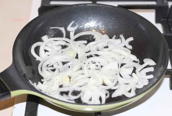 Теперь приступаем к непосредственному приготовлению начинки для постной лазаньи. На сковороде разогреть 2-3 ложки растительного масла и выложить половинку лука нарезанную полукольцами. Обжаривать помешивая 3-4 минут.