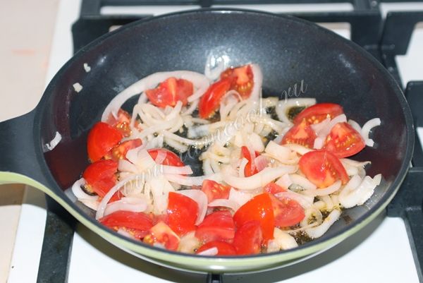 Добавить помидоры, обжаривать еще 3-4 минут. На этом этапе уже появляется очень приятный запах.
