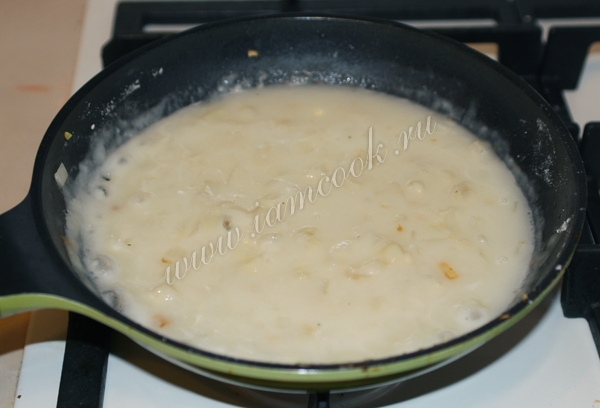 Ввести в сковороду горячую воду (воды добавляйте столько, чтобы соус получился по консистенции, как жидкая сметана) и готовить на маленьком огне, помешивая, 3 минуты, чтобы в соусе не образовывались комочки. Конечно лучшим вариантом будет использовать вместо воды овощной бульон, но у меня его небыло.