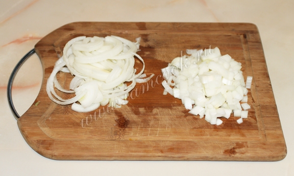 Большую луковицу разрезать пополам. Одну половину мелко нарубить, другую нарезать полукольцами. Если у Вас нет крупной луковицы, возьмите 2 маленькие.