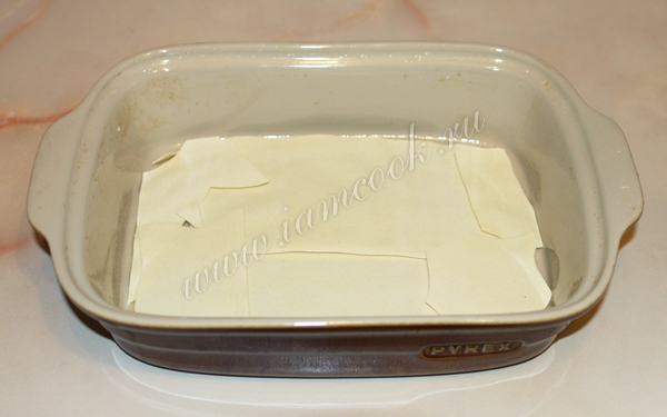 Финальным этапом будет запекание лазаньи в духовом шкафу. Форму для запекания смазать растительным маслом и выложить 2-3 листа лазаньи. Не бойтесь ломать их, они подобно макаронам, слипнутся во время приготовления.
