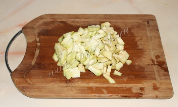 Баклажан вымыть, очистить от кожуры и нарезать небольшими брусочками.