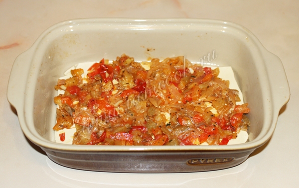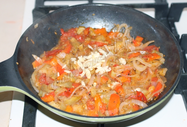 Далее добавить сладкий перец, баклажаны и помидоры. Посолить и как следует перемешать. Обжаривать помешивая 3-4 минут. Затем накрыть крышкой и тушить 7-8 минут. Выключить газ, добавить 2 зубчика мелко нарубленного чеснока и перемешать. В самом конце добавить базилик и еще раз перемешать. На этом приготовление начинки закончено.