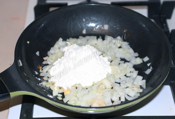 Добавить в сковороду 3 столовые ложки муки и перемешать, обжарить буквально 3 секунд.