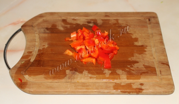 Красный сладкий перец вымыть, очистить от семян и мелко нарезать.