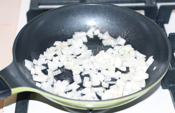 Теперь приступим к приготовлению соуса Бешамель, по традиционному рецепту он готовится из молока и сливочного масла, но так как у нас постный вариант лазаньи, возьмем самые простые ингредиенты. И первое что необходимо сделать, обжарить лук на растительном масле.