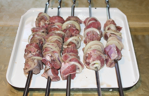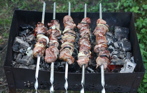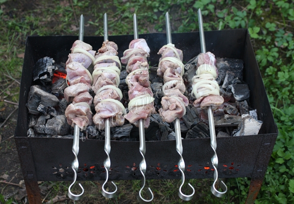 В мангале разогреть угли, чтобы они давали хороший жар. Поставить шампуры с мясом на мангал.